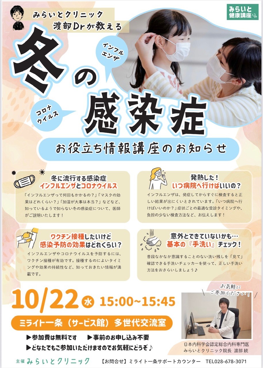 インフルエンザやコロナウイルスが流行しやすい冬の季節に向けて、みらいとクリニックの渡部院長が、症状に応じた「適切な受診のタイミング」や「家庭でもできる簡単な感染症対策」、そして「予防のためのワクチン接種」について、わかりやすく解説します。