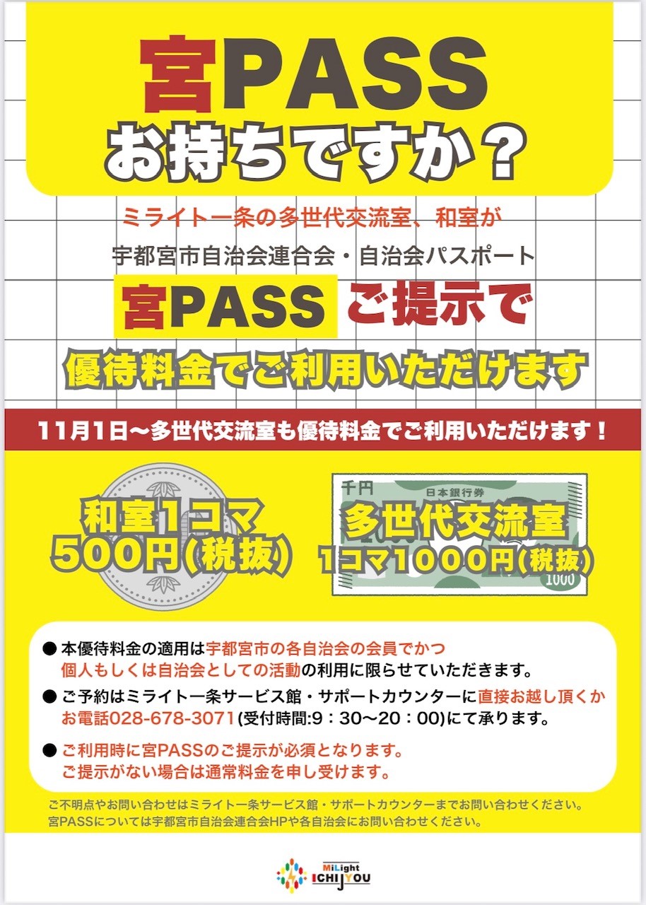 ミライト一条 多世代交流室 の【宮PASS割】を実施いたします!